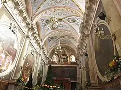 Chandeliers hang from an arched ceiling, rife with more pendentives just above the capitals of Doric-styled columns. A balcony above the common area contains a pipe organ and a small number of seats, usually reserved for important guests. Below, the common area consists of a main section in front of the altar, and two on the sides.