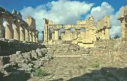 The temple was toppled by the 365 Crete earthquake.[15] Some time thereafter, Christians purged the structure, thoroughly smashing the internal columns and statues and burning the ruins.[16][17] The head of a life-size statue of Zeus from the sanctuary was smashed into over a hundred pieces.[16]