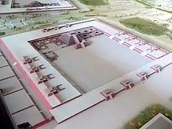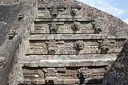 The Feathered Serpent Pyramid is a six-level step pyramid built in the talud-tablero style. The outside edges of each level are decorated with feathered serpent heads alternating with those of another snake-like creature, often identified as Tlaloc. Nevertheless, Mary Ellen Miller and Karl Taube claim that these heads may represent a "war serpent",[8] while Michael D. Coe claims, somewhat similarly, that they probably represent the "fire serpent" wearing a headdress with the Teotihuacan symbol for war.[9] In the eyes of these figures there is a spot for obsidian glass to be put in, so when the light hits, its eyes would glimmer. In antiquity the entire pyramid was painted – the background here was blue with carved sea shells providing decoration.[9] Under each row of heads are bas-reliefs of the full feathered serpent, in profile, also associated with water symbols. These and other designs and architectural elements are more than merely decorative, suggesting "strong ideological significance", although there is no consensus just what that significance is. Some interpret the pyramid's iconography as cosmological in scope – a myth of the origin of time or of creation – or as calendrical in nature. Others find symbols of rulership, or war and the military.[10]