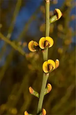 Templetonia egena is a multi-branched shrub 1–3 m (3 ft 3 in – 9 ft 10 in) high with ridged, upright, yellow-green stems 1–3 mm (0.039–0.118 in) wide, rounded at the apex, leaves small, triangular scales. Flowers are borne in pairs or singly in leaf axils, 6–9 mm (0.24–0.35 in) long, pea-like, thickly racemose, pedicel less than 1 mm (0.039 in) long and petals yellow or reddish brown. Flowering occurs mostly in spring and the fruit is a flattened, oval to oblong pod 10–20 mm (0.39–0.79 in) long and usually one-seeded.[2][3]