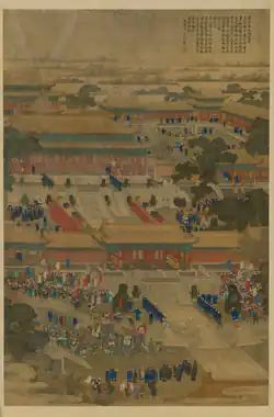 Ten Thousand Nations Coming to Pay Tribute (Chinese: 萬國來朝圖; pinyin: Wànguó láicháo tú, 1761) is a monumental (299x207cm) Qing dynasty painting depicting foreign delegations visiting the Qianlong Emperor in the Forbidden city in Beijing during the late 1750s.[1]