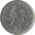 The original reverse of the coin, designed by Christopher Ironside, and used from 1968 to 2008, is a crowned lion (formally, Part of the crest of England, a lion passant guardant royally crowned), with the numeral "10" below the lion, and either NEW PENCE (1968–1981) or TEN PENCE (1982–2008) above the lion.