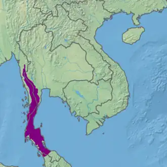 The Tenasserim–South Thailand semi-evergreen rain forests[2] is a tropical moist broadleaf forest ecoregion on Mainland Southeast Asia. The ecoregion extends north–south along the Kra Isthmus. It includes lowland forests along the coasts, and montane forests on the Tenasserim Hills and Bilauktaung range, which form the mountainous spine of the isthmus.