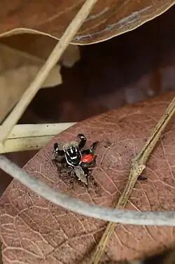 Day active individuals were found to rest in silken retreats constructed in curled dry leaves. A female was also observed in captivity, which laid eggs twice during the period and in the absence of leaves it was found in the corners of aquariums at night. It avoided mosquitoes, houseflies and ants but lavishly fed on fruit flies (of unspecified spp. of the Tephritidae or Drosophilidae families), on one instance, when 30 fruit flies were released into the box with the female, all of them were consumed in the same day. It guarded it's egg sac and ventured out only for capturing prey when the fruit flies were released in the box. A second egg sac was laid after a gap of about ten days and cannibalism among the newly hatched spiderlings was observed. While it took about 2 hours and 40 minutes for a spiderling to consume a fruit fly, it was about 15 minutes for the female.[2]