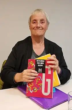 She is a noted linguist in the academic field for her critical and purposeful analysis of the androcentric opacity of social discourse.[10] She has published various articles on issues related to the invisibility of women in language.[11] In 2002, she published a manual on a non-sexist use of language, entitled Porque las palabras no se las lleva el viento (Because the words are not carried away by the wind).[12] In 2016, she attended the 2016 Feminist Debate Conference in Montevideo, as a special guest.[13] She also carried out an activity on language, sexism, and communication at the Centro de Formación de la Cooperación Española (Spanish Cooperation Training Center).[14]