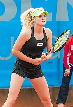 Due to weak tour level performances, she was forced to also play some ITF tournaments. As her preparation for the following clay season, she played at the $80k Zaragoza tournament, where she was advanced to the final. Despite losing to Viktoriya Tomova in the final, it was her first significant result of the year. Still, she continued to struggle with results, since she was eliminated in the qualifying of the Madrid Open, reaching only first round of the Italian Open and losing in the first round of the French Open. During the grass-court season, she recorded her second tour win of the year at the Birmingham Classic.[9][10] After a first-round loss at Wimbledon,[11] she started with some better results when she reached semifinals of the WTA Challenger at Contrexéville, France.[12] She followed this up with the second round of the Warsaw Open,[13] quarterfinals at the Prague Open,[14] and another quarterfinal at the WTA Challenger Polish Open.[15]