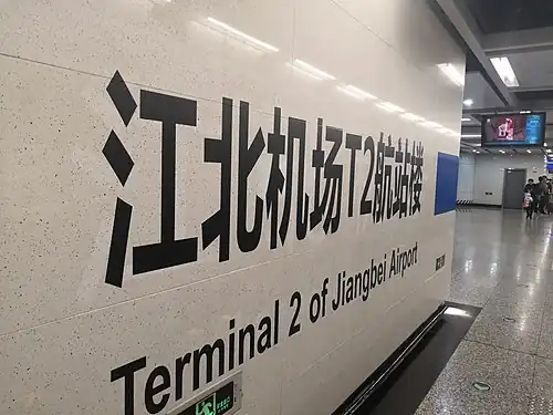 Terminal 2 of Jiangbei Airport, previously known simply as Jiangbei Airport, is an interchange station of Line 3 (straddle beam monorail) and Line 10 (heavy rail subway) of Chongqing Rail Transit in Yubei District of Chongqing Municipality, China.[1][2] The station opened in 2011 with Line 3 and was expanded in 2017 with Line 10, alongside changing to its current name to differentiate itself from the station at Terminal 3A of the airport.