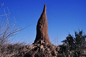 Termitomyces schimperi do not appear on all termite mounds.[5] When present, they have been recorded on termite mounds of central and northern Namibia in areas with an average rainfall over 350 mm. The mounds can often extend to 3-4 m in height with their apices inclined towards the north. The associated termite is Macrotermes michaelseni (Sjöstedt, 1914).[5] (This termite is recorded in some literature [See [5]] as "Termes bellicosus", a misapplied name, where some former subspecies are since treated as junior subjective synonyms of Macrotermes michaelseni).