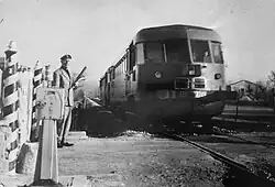 ALn 556 diesel multiple unit near a level crossing in Onna in the 1960s