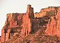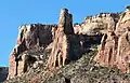 Terra Tower is a 5,790-foot-elevation (1,760-meter) sandstone pillar located in Colorado National Monument, in Mesa County of western Colorado, United States.[3] This 350-foot-high tower is situated on the Redlands escarpment, approximately seven miles west of the community of Grand Junction. Topographic relief is significant as it rises 1,000 feet (300 meters) above the Tiara Rado Golf Course in approximately one-half mile. The first ascent of the summit was made in 1979 by Harvey Carter and Tom Merrill via the class 5.11 route, Way Bazaar.
