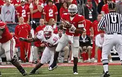 On September 20, 2008, Pryor threw for a freshman school-record four touchdowns and one interception in his first career start for Ohio State. Ohio State beat Troy 28–10.[23] On October 4, 2008, Pryor ran for the winning touchdown against Wisconsin on an option play with running back Chris "Beanie" Wells.[24] On October 25, 2008, in an Ohio State loss against Penn State Pryor threw for a career-high 226 yards, connecting on 16 of 25 passes.[25][26] Against Illinois on November 15, 2008, Pryor had his first career 100-yard rushing day running for 110 yards and a touchdown.[27] In the Fiesta Bowl against Texas, he lined up at receiver and caught his first touchdown pass in college.[28] Pryor led Ohio State to an 8–1 record as a starter in his freshman year; his only loss as a starter was against Penn State. (Todd Boeckman made the start in the Fiesta Bowl against Texas.) Following the 2008 Big Ten Conference football season, he was an honorable mention All-Big Ten Conference selection by the media and Big Ten Freshman of the Year by the coaches.[29]