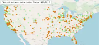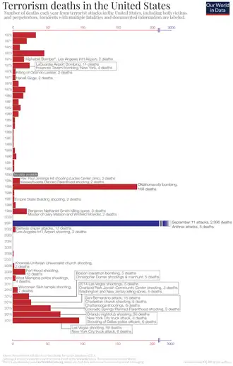 In 2019, Matthew Alcoke, Deputy Assistant Director of the FBI Counterterrorism Division, defined domestic terrorists as "individuals who commit violent criminal acts in furtherance of ideological goals stemming from domestic issues."[14] Although acts of violence by domestic extremists meet the definition, no US criminal charge for domestic terror exists. Rather, the phrase is an FBI investigative category used to classify four types of extremism: "racially motivated violent extremism, anti-government/anti-authority extremism, animal rights/environmental extremism, and abortion extremism."[14] A 2017 report by the U.S. Government Accountability Office found that out of the 85 deadly extremist incidents which had occurred since September 11, 2001, white supremacist extremist groups were responsible for 73%, while radical Islamist extremists were responsible for 27%. The total number of deaths caused by each group was about the same. However, 41% of the deaths were attributable to radical Islamists and they all occurred in a single event — the 2016 Orlando nightclub shooting in which 49 people were killed by a lone gunman. No deaths were attributed to left-wing groups.[15][16] A 2017 report by Type Media Center and The Center for Investigative Reporting analyzed a list of the terrorist incidents which occurred in the US between 2008 and 2016 and included the 2014 killings of NYPD officers and the 2016 shooting of Dallas police officers (a total of seven deaths saying that they could "plausibly be attributed to a perpetrator with such sympathies").[17]
