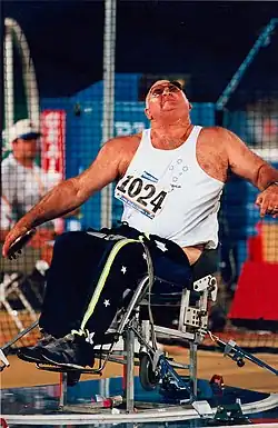 Just before the 2000 Sydney Paralympics, his classification was changed from F56 to F55, and he was told that he had been competing in the wrong disability group for his entire career.[13] He did not win any medals at the 2000 Games.[11] Giddy regretted his disqualification by video footage in the shot put at the Sydney Games after throwing a world record.[10] In 2002, while training in Germany for the world titles in France, he cracked his sternum and hurt his back in a fall. He then prepared for the 2004 Athens Paralympics, but the back injury had flared up again, and the plate in his back had broken in half. He retired in early 2004 due to the injury.[10] He came back for the 2006 Melbourne Commonwealth Games, where he came seventh in the seated shot put, and was Australia's oldest ever Commonwealth Games athlete.[14] At his farewell dinner in 2004, Chris Nunn, Head Coach of the Australian Athletics team at the Sydney Games, said "Whilst you may have travelled thousands of miles in economy class, your contribution has always been first class".[10]
