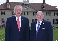 McAuliffe was an unsuccessful candidate for the Democratic nomination in the 2009 Virginia gubernatorial election. In the 2013 gubernatorial election, after he ran unopposed in the Democratic primary, he defeated Republican Ken Cuccinelli and Libertarian Robert Sarvis in the general election.[1] Due to Virginia law barring governors from serving consecutive terms, he was succeeded by his lieutenant governor, Ralph Northam. McAuliffe ran for a non-consecutive second term as governor in the 2021 gubernatorial election but lost to Republican nominee Glenn Youngkin.[5][6]
