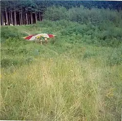 After teaching himself to fly various types of fixed-wing gliders in the late 1960s,[2] by the early 1970s, Sweeney was sharing his enthusiasm for the sport by teaching others. His beginner lessons in the "Clay Pit", an open field by a slope near his house in Dunbarton, New Hampshire, were well known throughout the East Coast by hang gliding aficionados.[6] The hill has become overgrown with trees and is now part of a popular motocross trail called Hang Glider Hill in the Hopkinton-Everett Multi-Use Trail System in Weare, New Hampshire.[7]