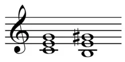 In music theory, Terzschritt (German: third step) is the progression from one major chord to another major chord, or a minor chord to another minor chord by major third root movement.[1] Additionally, and more specifically, it is a dualistic major third relationship, in which the ascending progression from a major tonic triad to major mediant triad is equivalent to the descending one between a major tonic triad and a flat subdominant minor triad. The major chord on the mediant is itself the Terzklang (De: third chord).