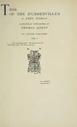 Tess of the d'Urbervilles: A Pure Woman is the twelfth published novel by English author Thomas Hardy. It initially appeared in a censored and serialised version, published by the British illustrated newspaper The Graphic in 1891,[1] then in book form in three volumes in 1891, and as a single volume in 1892. Although now considered a major novel of the 19th century, Tess of the d'Urbervilles received mixed reviews when it first appeared, in part because it challenged the sexual morals of late Victorian England.