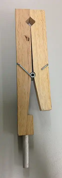 A test tube holder is used to hold test tubes.[1] It is used for holding a test tube in place[2] when the tube is hot or should not be touched.[3] For example, a test tube holder can be used to hold a test tube while it is being heated.[4] Moreover, when heating the tube with liquid or solid contained inside, the holder ought to tightly hold a test tube[5] in order for the tube to be safely held while heating.[6]