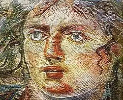During the second to fourth centuries AD, Tethys—sometimes with Oceanus, sometimes alone—became a relatively frequent feature of mosaics decorating baths, pools, and triclinia in the Greek East, particularly in Antioch and its suburbs.[52] Her identifying attributes are wings sprouting from her forehead, a rudder/oar, and a ketos, a creature from Greek mythology with the head of a dragon and the body of a snake.[53] The earliest of these mosaics, identified as Tethys, decorated a triclinium overlooking a pool, excavated from the House of the Calendar in Antioch, dated to shortly after AD 115 (Hatay Archaeology Museum 850).[54] Tethys, reclining on the left, with Oceanus reclining on the right, has long hair, a winged forehead, and is nude to the waist with draped legs. A ketos twines around her raised right arm. Other mosaics of Tethys with Oceanus include Hatay Archaeology Museum 1013 (from the House of Menander, Daphne),[55] Hatay Archaeology Museum 9095,[56] and Baltimore Museum of Art 1937.126 (from the House of the Boat of Psyches: triclinium).[57]