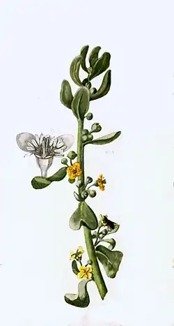 Tetragonia fruticosa, or kinkelbossie, is an endemic Southern African coastal perennial shrub or scrambler, well-suited to dune sand stabilisation and often browsed by livestock and game. It is found from sea-level to about 1100 metres.[1]