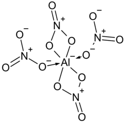 The tetranitratoaluminate group has two bidentate nitrate groups attached in a square around the aluminium, and with two other monodentate nitrates attached via one oxygen only, perpendicular, up and down from the square.[4]