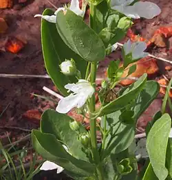 Teucrium integrifolium, commonly known as teucry weed or green germander,[2] is a species of flowering plant in the family Lamiaceae and is endemic to northern Australia. It is a perennial herb with broadly elliptic to broadly egg-shaped leaves and white or cream-coloured flowers.