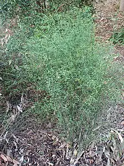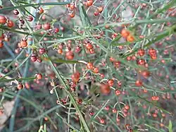 Teucrium junceum is an openly-branched, scrambling shrub that typically grows to a height of 1–2 m (3 ft 3 in – 6 ft 7 in) and has glabrous stems that are square in cross-section. The leaves are arranged in opposite pairs, narrow-elliptic or lance-shaped, 3–18 mm (0.12–0.71 in) long, 2–3 mm (0.079–0.118 in) wide but often scale-like or shed from older stems. The flowers are borne on a pedicel about 3 mm (0.12 in) long with scale-like bracts 0.5–1.5 mm (0.020–0.059 in) long. The five sepals are 1.5–2.5 mm (0.059–0.098 in) long, the petals white and 3–4 mm (0.12–0.16 in) long. Flowering mainly occurs in summer and the fruit is an orange to red drupe 2–4 mm (0.079–0.157 in) in diameter.[2][3]