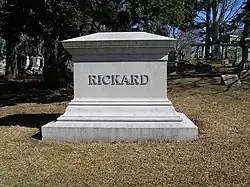 On December 26, 1928, Rickard left New York for Miami Beach, Florida, where he was completing arrangements for a fight between Jack Sharkey and Young Stribling and attending the opening of the Miami Beach Kennel Club. On New Year's Eve, Rickard was stricken with appendicitis and was operated on.[52] Rickard died on January 6, 1929, due to complications from his appendectomy.[1] He was interred at Woodlawn Cemetery, Bronx, NY.