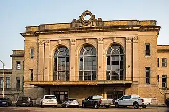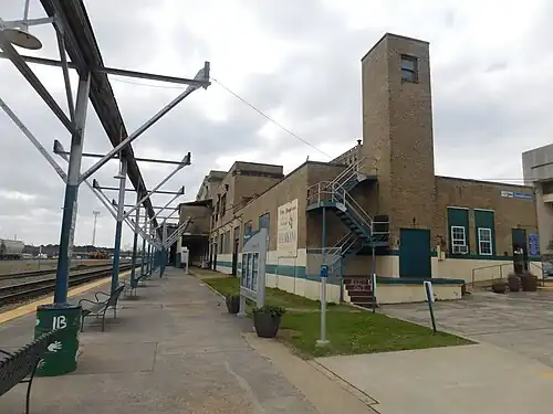 Texarkana Union Station is a historic train station in the Texarkana metropolitan area serving Amtrak, the United States' national passenger rail system. The Arkansas-Texas border bisects the structure; the eastern part, including the waiting room and ticket office, are in Texarkana, Arkansas, but the western part is in Texarkana, Texas, meaning stopped trains span both states. The station was built in 1928 and was added to the U.S. National Register of Historic Places in 1978. Today it is the second busiest Amtrak station in Arkansas.[3]