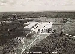 In 1921 the company listed its stock on the New York Stock Exchange.[7][3] Sulfur production began in 1919 and by 1925 the company controlled 40% of the U.S. market.[1] In 1927, the company started developing the sulfur deposit associated with the Boling Dome in Wharton County, Texas. Besides building a plant in 1928, the company also built Newgulf, Texas for its employees. By 1958, the company had produced 50 million tons of sulfur, 38 per cent of all the sulfur produced by the Frasch process to that date.[6]: 118–124 In the 1950s, Texas Gulf Sulphur Company used the Spindletop Hill site for salt-brine extraction.[8]