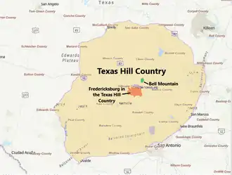 Texas Hill Country is an American Viticultural Area (AVA) located in Central Texas north and west of the portion of the Balcones Fault which runs west of the cities of San Antonio and Austin, respectively. The 9.6-million-acre (15,000 sq mi) viticultural area expands across the Edwards Plateau.[7] It was established as the nation’s 136th and Texas’ fourth AVA on November 29, 1991 by the Bureau of Alcohol, Tobacco and Firearms (ATF), Treasury after reviewing a petition submitted by Mr. Edwin Auler, on behalf of Hill Country winery and vineyard owners, proposing a viticultural area in central Texas, to be known as "Hill Country."[8] The petitioner subsequently amended the petition to request that the name be changed to "Texas Hill Country." It is the state's southernmost viticultural area and geographically the third largest AVA after Upper Mississippi River Valley and Ohio River Valley. At the outset, there were 40 "commercial and/or significant experimental" vineyards and 10 commercial wineries, but, after 35 years, there are approximately 100 wineries/vineyards.[4] There are two previously established viticultural areas entirely encompassed within Texas Hill Country. The sub-appellations are "Bell Mountain" (1986) and "Fredericksburg in the Texas Hill Country" (1988), both located within Gillespie County.[1]