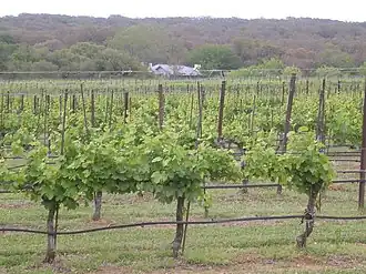 Despite the cultural influence of the German settlers, most of the grape varietals grown in the Texas Hill Country originate from France, Italy, or Spain rather than the cooler climate of Germany.[12][15] Fall Creek is the original vineyard of Texas Hill Country, owned by the pioneer vintners in the area, Susan and Ed Auler. The couple established the vineyard in 1975 after noticing the similarities between the soil and the climate in Texas' Hill Country and southern France. Winery Road is the name of the "wine trail" along U.S. Highway 290 accessible to many of the Hill Country wineries/vineyards.[16] Although Fredericksburg and Bell Mountain are their own AVAs, most wineries use Texas Hill Country on their wine labels since producers maintain the Texas Hill Country appellation is more recognizable and appreciated by consumers.[7]