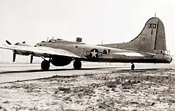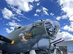 In July 1970, the plane was given its first historical paint job, that of the 366th Bombardment Squadron of the 305th Bombardment Group, with squadron code KY and call letter D on the fuselage and tail number 124592, suggested by retired general LeMay.[3] In 1974, the CAF assigned the plane to its three-year-old Gulf Coast Wing.[3] The plane was named Texas Raiders around 1973 to honor Texas combat veterans; the name had not been used by any previous B-17.[3]