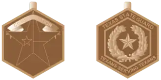 The medal pendant is of bronze, hexagonal in shape with one point facing upwards, 1+1⁄4 inches from top point to bottom point, and 1+1⁄10 inches wide. On the obverse side of the pendant is a five-pointed raised star, one point up, 1 inch in diameter, encasing the design of the flag of Texas. Over the top triangle of the five-pointed star is a banner that reads, "COMMENDATION". On the reverse side of the pendant is a five-pointed raised star, one point up, 5⁄16 of an inch in diameter surrounded by a wreath formed by an olive branch on the right and a live oak branch on the left, surrounded by the words "TEXAS STATE GUARD" along the upper point and "TEXANS SERVING TEXANS" along the lower point, in raised letters.[3]