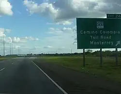 State Highway 255 (SH 255) is state highway in the U.S. state of Texas that allows international traffic to bypass Laredo. Located in Webb County, the highway provides a connection between the Laredo–Colombia Solidarity International Bridge to Interstate 35 (I-35).[1] The route opened in 2000 as the Camino Colombia Toll Road, and was one of the few operating toll roads in the United States to have gone through the legal process of foreclosure. The toll designation was removed from the route in 2017.[2]