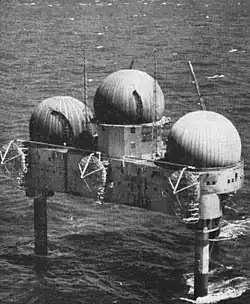 Each platform was equipped with one AN/FPS-3 (later upgraded to AN/FPS-20) search radar and two AN/FPS-6 height finder radars, each housed in a separate spherical neoprene radome 55 feet (17 m) in diameter.[4] Originally the towers were to be linked to shore by submarine cable, but this was eventually rejected as too costly; the AN/FRC-56 tropospheric scatter microwave link was installed instead, with an array of three parabolic antennas attached to one edge of the platform.[2] UHF and VHF equipment allowed communication with ships and aircraft as well as providing a backup to the microwave link.