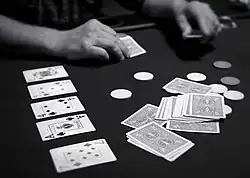This method consists of counting the cards still in the deck, which in combination with the cards the player already has can give the player a potentially winning hand. Such cards are called "outs", and hand strength can be measured by how many outs are still in the deck (if there are many outs then the probability to get one of them is high and therefore the hand is strong). The following chart[58] determines the probability of hitting outs (bettering the player's hand) based on how many cards are left in the deck and the draw type.
