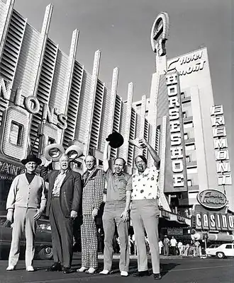 Johnny Moss, Chill Wills, Amarillo Slim, Jack Binion, and Puggy Pearson outside Binion's Horseshoe in Las Vegas in 1974