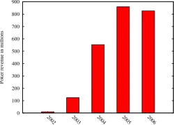 Poker revenues from Party Gaming (2002–2006). The drop off in 2006 is due to the UIGEA.