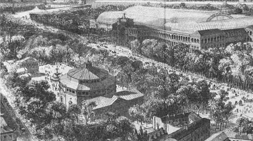 In the spring of 1855 the composer Jacques Offenbach decided that the position of this modest wooden theatre was perfectly situated on the Carré Marigny to catch overspill traffic from the Universal Exposition of 1855; after some modifications to the site he opened the Théâtre des Bouffes-Parisiens on 5 July 1855. The theatre had a capacity of only 300 spectators.[5] At the inaugural performance, Offenbach conducted four of his own works, the last of which was Les deux aveugles, a one-act bouffonerie musicale about two swindling "blind" Parisian beggars. This little piece soon acquired an international reputation due to visitors from the Exposition and due to some controversy over its subject matter. Another notable premiere that summer was Le violoneux. Further performances in the summer of 1855 were primarily of satirical sketches which only included a few musical numbers. The season, however, was so successful that Offenbach was able to resign his position as conductor of the Théâtre Français.[6] This theatre was soon renamed Bouffes d'Été, as during the winter Offenbach directed the Bouffes d'Hiver in the Salle Choiseul on the rue Monsigny. The company also used the Salle Lacaze for the 1856, 1857, and 1859 summer seasons, and a total of 16 Offenbach pieces were premiered here by the Bouffes-Parisiens.[7]