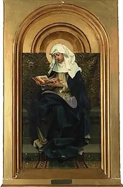 In his religious scenes Lybaert used an archaic, Gothic style that reprised the 16th century models of Northern-European masters such as Hans Memling and Albrecht Dürer.[2] These works earned him the appelation of 'modern Gothic' or 'contemporary Memling'.[3] He conducted a thorough historical research of the works of Memling in the Old St. John's Hospital in Bruges and conducted intense costume and architecture studies for his historical scenes and the various Stations of the Cross, which he painted. Lybaert was not the only Belgian painter who around this time harked back to the early masters and created 'reactionary' religious works. The latter part of the 19th century saw other Flemish artists experiment with this medieval revivalism in romantic painting. Particularly in the city of Bruges a number of artists, such as Edmond Van Hove, created religious subjects in a style similar to that of Lybaert. The subject of the Madonna with Child was particularly dear to Lybaert. He often depicted a Madonna against a gilt background or with a view of the city of Ghent in the background.[11]