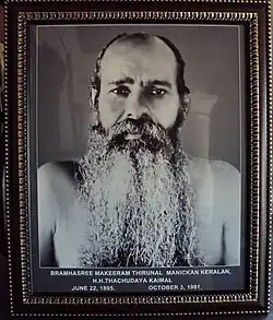 Mahatma Gandhi, recognising that by ancient law and custom the Thachudaya Kaimal had ultimate spiritual authority over the Hindus, visited Irinjalakkuda during the 1930s to persuade the Kaimal to order by decree the Temple Entry Proclamation and to persuade the Maharaja to issue an ordinance to abolish untouchability.[5] Following Gandhi's visit and Temple Entry in Travancore, an attempt to depose the Thachudaya Kaimal as a ruling chief and outcaste the Maharaja of Travancore from Hinduism was instigated by the Raja of Cochin but the Kaimal was reinstated by the British Raj authorities with an order from the Viceroy and Governor-General of India.[6]