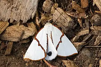 The Orange-rimmed Satin Moth (Thalaina selenaea) is a moth of the family Geometridae. The species was first discovered by Henry Doubleday in 1845. It is found throughout eastern Australia, including Tasmania. Although the common name Satin Moth is sometimes used for this species, that name is already applied to Leucoma salicis, an unrelated species native to Europe and Asia.