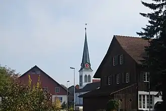 Thalheim an der Thur is first mentioned in 1166 as Torlinchovin. In 1257 it was mentioned as Torlinkon. Until 1878 it was Dorlikon.[3] The name may have originated from the Alamanni name Torilo which originated in the 7th century. However, as this name could easily be taken to mean "Fools' Village" (from the nowadays old-fashioned expression Tor, German for "fool"), the community was granted a name change to Thalheim an der Thur in 1878. The original name is still used in the area.
