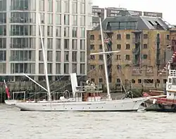 Downstream from the London Bridge was an "Avenue of Sail", where powered and sailing vessels too tall to pass under the city's bridges were moored on either side of the river. These included Amazon, an 1885 pleasure yacht that was present at the 1897 naval review marking Queen Victoria's Diamond Jubilee;[20] the sail training brig, TS Royalist; Belem, a three-masted sail training ship; the Golden Hinde replica of Sir Francis Drake's historic ship; the Matthew of Bristol, a replica of a Tudor merchant ship; the Provident, a Brixham trawler, Gypsy Moth IV in which Sir Francis Chichester solo-circumnavigated the world, Sail Training Vessel Challenge Wales | Wales' Tall Ship which works with young people to improve their employment prospects, Sheemaun (Motor Yacht) a 1930s Gentleman's Motor Yacht that served in WW2 as HMY Sheemaun an armed Thames Estuary Auxiliary Patrol Boat and the Tenacious, of the Jubilee Sailing Trust which provides opportunity for able-bodied and disabled people to sail together.[16]