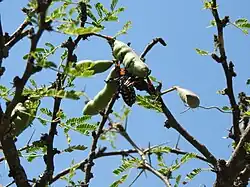Its host plants are primarily mesquites and other Fabaceae members. Their monophagous feeding habits make them dependent on these plants, further linking them to the ecosystems and cultural practices of the regions where they are found. It feeds on the sap, tender leaves, and green pods of various species such as mesquites (Prosopis laevigata, Prosopis juliflora, Prosopis velutina) and huizaches (Vachellia farnesiana), and others such as palo verde (Parkinsonia aculeata), pata de vaca (Bauhinia variegata), palo santo (Platymiscium trifoliolatum), and plumerillos (genus Calliandra).[7][9]