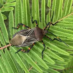 It has a distinctive appearance, with a broad, somewhat flattened body and long, segmented antennae. The nymphs are wingless and feature striking reddish-orange and black coloration, while adults develop fully formed wings and tend to have a darker, more muted appearance. Like other members of Coreidae, Thasus gigas possesses a straw-like proboscis, which it uses to pierce plant tissues and extract sap. One notable characteristic of both nymphs and adults is their ability to excrete a strong-smelling yellow fluid when threatened, serving as a defensive mechanism against predators.