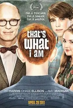 That's What I Am is a 2011 American comedy-drama film directed by Michael Pavone and starring Ed Harris and Chase Ellison.[3] It received a limited release on April 29, 2011, and was later released on DVD on July 15, 2011. It was filmed at Riverdale High School in Jefferson, LA.