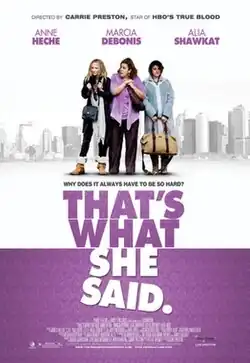 That's What She Said is a 2012 American comedy film directed by Carrie Preston, written by Kellie Overbey, and starring Marcia DeBonis, Anne Heche, Alia Shawkat, and Miriam Shor.