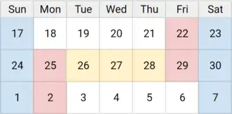 ![]() Calendar of April and May 2011, showing weekends (blue), bank holidays (red) and days potentially taken off work (yellow) | |
